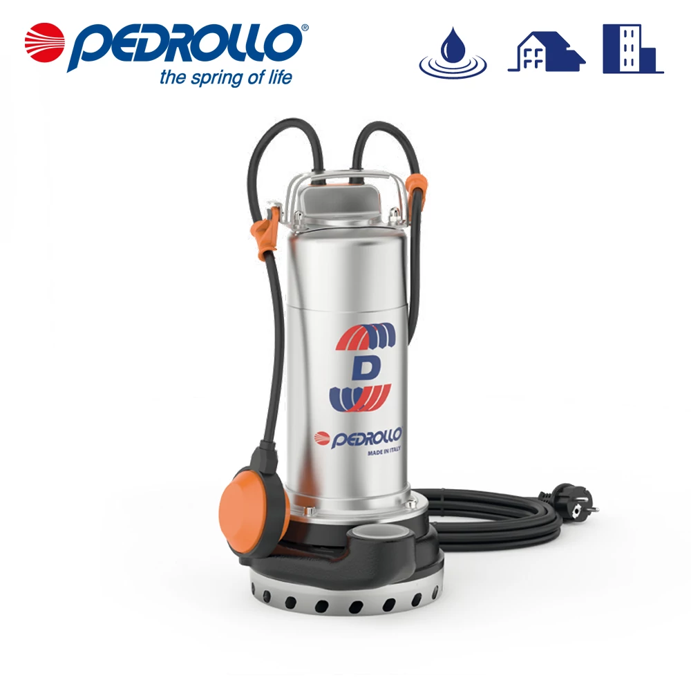 Merülőszivattyúk tiszta vízhez TELJESÍTMÉNYTARTOMÁNY • Hozam akár 300 l/perc (18 m3/h) • Emelőmagasság 26 m-ig TELEPÍTÉS ÉS HASZNÁLAT A tiszta vagy enyhén szennyezett víz elvezetésére tervezett D-sorozatú szivattyúk ideálisak háztartási és lakossági alkalmazásokhoz, beleértve a pincék és a garázsok árvízvédelmét, az úszómedencék és a tartályok vízelvezetését, valamint a nem szennyvízelvezetést. Ezek a megbízhatóságukról ismert szivattyúk kiválóak az automatizált fix telepítésekben. ALKALMAZÁSI KORLÁTOK • Vízszint alatti mélység 5 m-ig (megfelelő méretű tápkábellel) • Folyadék hőmérséklete +40 °C-ig • Lebegő szilárd anyagok feldolgozására alkalmas Ø 10 mm-ig • Alsó vízelvezető szint 17 mm-ig • Minimális merítés a folyamatos üzemelés érdekében: - 210 mm D 8-10-20-hoz - 250 mm D 30-hoz TARTALMAZZA ※ Tápkábel hossza: – 5 m D8, D10, D20 esetén – 10 m D30 esetén ※ Úszókapcsoló (kizárólag az egyfázisú modelleknél) KÉRÉSRE ELÉRHETŐ OPCIÓK ※ Szivattyúk 10 m-es tápkábellel. ※ Különböző feszültségigények 60 Hz frekvencia.
